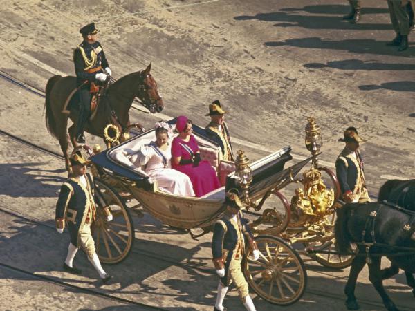 De prinsessen Margriet en Christina in een open koets, de Crème Calèche of Witte Kroningscalèche (datum onbekend). Het rijtuig werd gebouwd in 1898 en werd dat jaar door Koningin Emma cadeau gegeven aan haar dochter Wilhelmina.