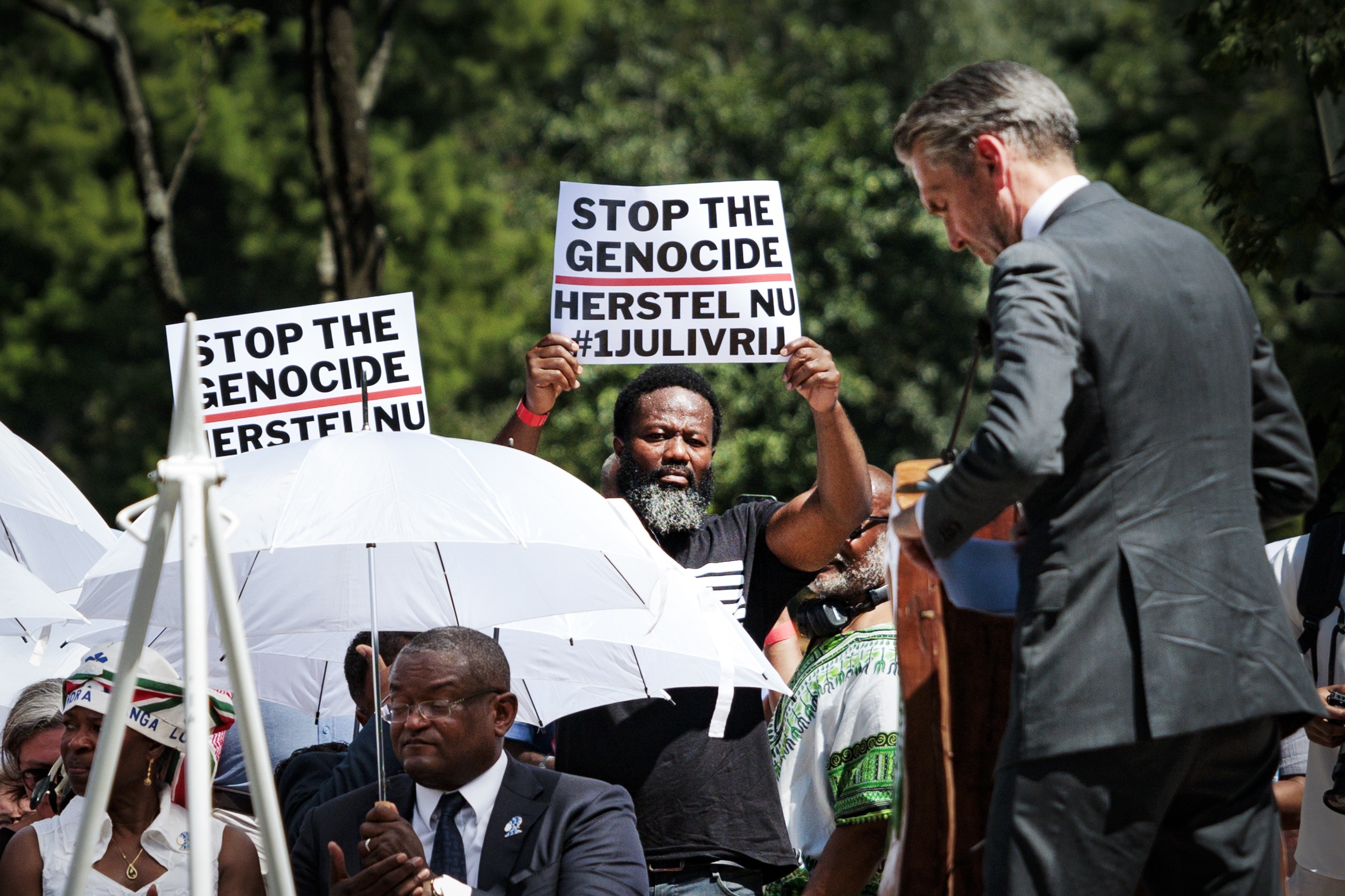 Tijdens Schoofs toespraak waren borden te zien met 'Stop the Genocide, Herstel nu #1julivrij'. Verslaggever Danny Simons was aanwezig in het Oosterpark waar de herdenking plaatsvond en licht toe: "Waarschijnlijk verwijzend naar de situatie in Gaza en de strijd om van 1 juli een nationale vrije dag te maken."