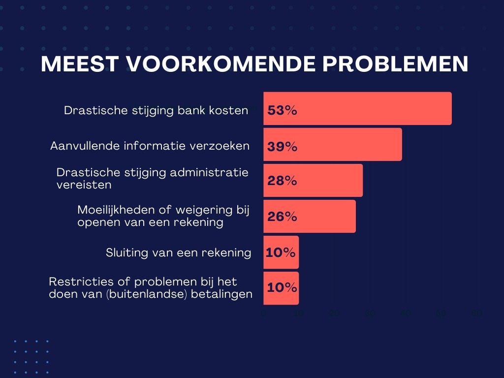 Meer dan de helft van Nederlandse stichtingen en verenigingen ervaart problemen met hun bankrekening of hun betalingsverkeer. Dorpshuizen, sportverenigingen en goede doelen hebben grote moeite met het krijgen van een bankrekening, moeten doorlopend vragen beantwoorden of kunnen plotseling geen betaling meer overmaken. Dat blijkt uit een enquête onder meer dan duizend maatschappelijke organisaties in Nederland.