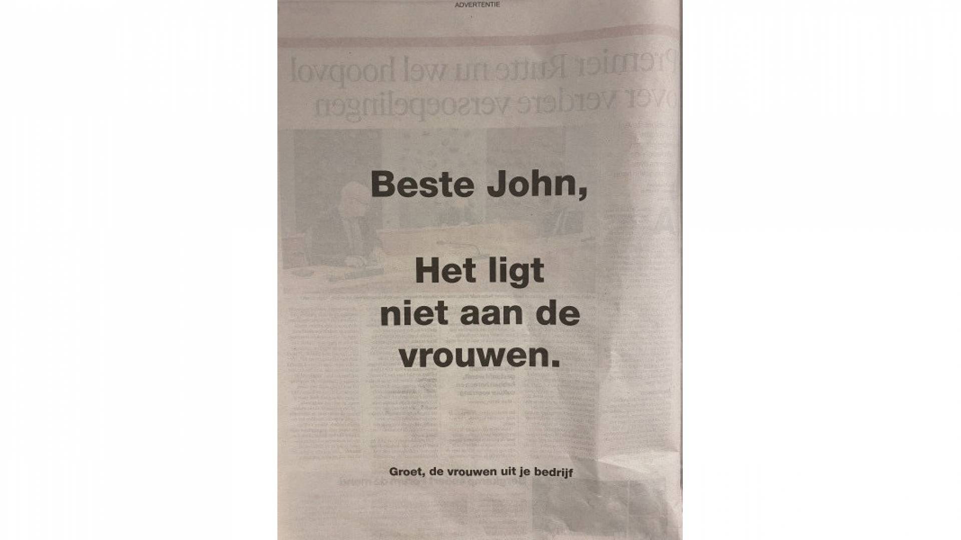 Teleurstellend, reageert de groep vrouwen in het AD op zijn weerwoord. Het zegt volgens hen veel over de cultuurverandering die nodig is in het bedrijf. "Het gedrag van vrouwen is niet het probleem. En ook niet de oplossing."