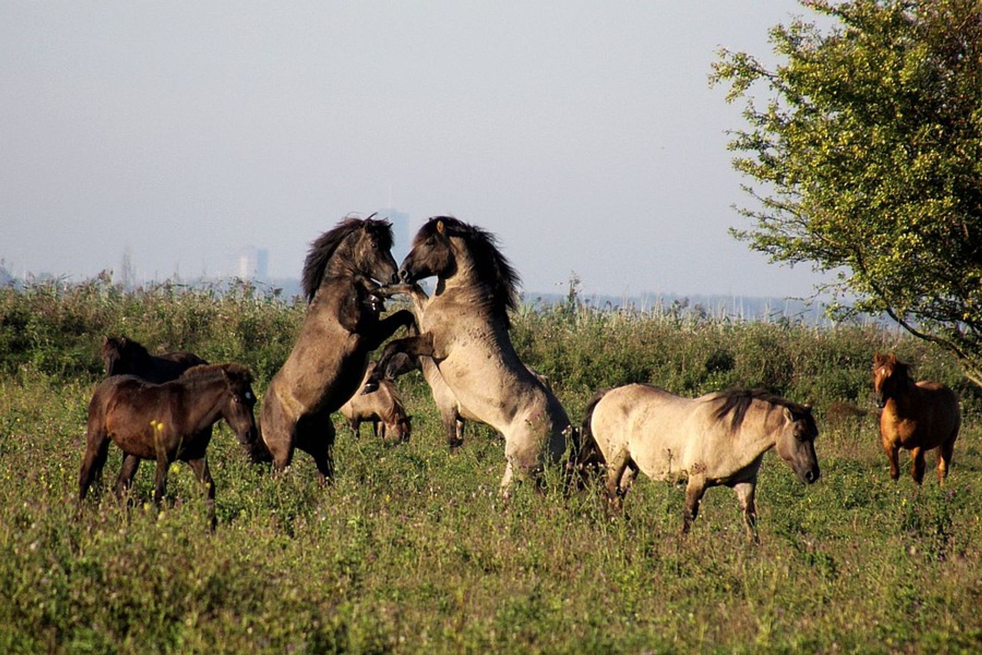 Hoe meer verschillende soorten grazers, hoe beter. En over het algemeen kunnen ze prima naast elkaar leven, zegt Tanja de Bode, kuddebeheerder bij Free Nature. "In een groot gebied kunnen ze elkaar gewoon ontlopen." Conflicten ontstaan vaak alleen wanneer er bijgevoerd wordt. "Dan is het een strijd: wie komt het eerst bij die baal hooi? Het wilde paard is dan een geduchte vijand om zijn snelheid."