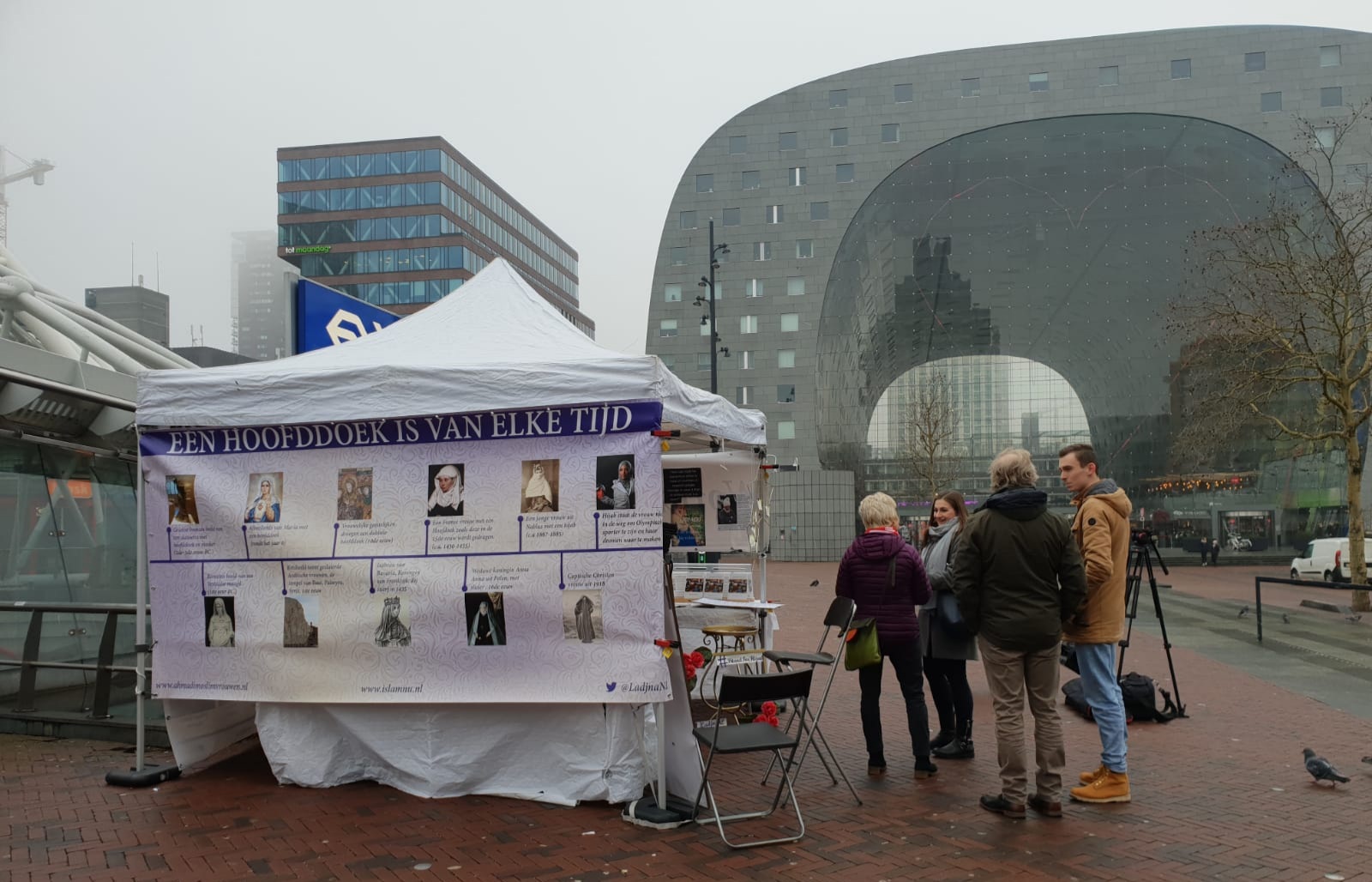 Spiegels en 'heel veel' hoofddoeken. Woensdagmiddag staan vrouwen van de Ahmadiyya Moslim Gemeenschap op Blaak in Rotterdam om voorbijgangers uit te nodigen en hoofddoek uit te proberen. "Een leuke manier van verbinden en elkaar beter leren kennen", vindt geneeskundestudent Sobia Laghari.