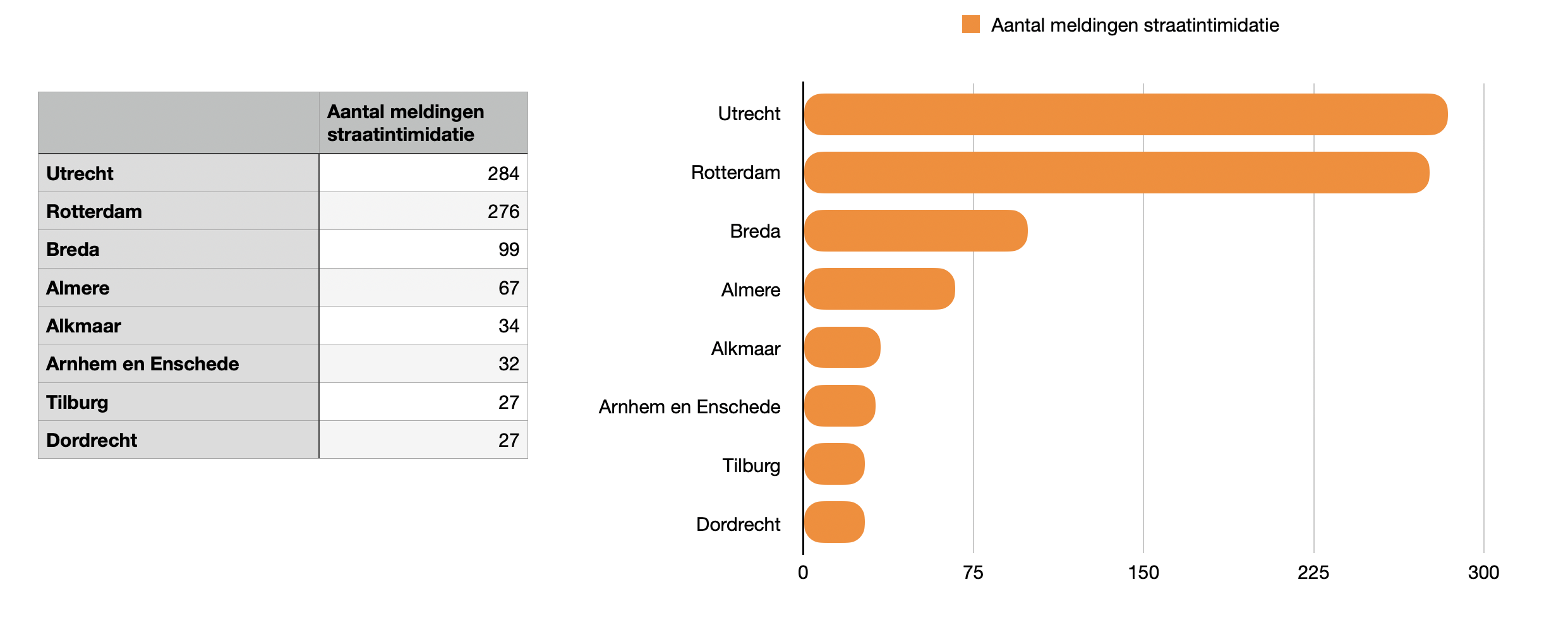 In Utrecht zijn in het afgelopen jaar 284 meldingen van straatintimidatie gemaakt. In de meeste gevallen gaat het om vrouwen die door mannen worden lastiggevallen. Ze melden dat ze worden nageroepen, nagefloten, achterna gelopen of tegengehouden. De meldingen komen uit alle Utrechtse wijken. Utrecht wordt op de voet gevolgd door Rotterdam waar in het afgelopen jaar 276 meldingen zijn binnengekomen. De meldingen in Rotterdam gaan voornamelijk om plekken waar veel mensen bij elkaar zijn, zoals OV-knooppunten, parken, pleinen en horeca- en winkelcentra.