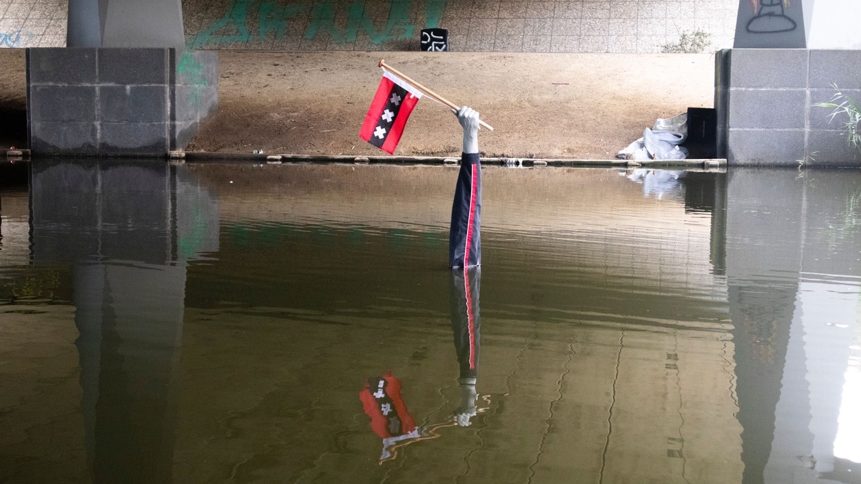 Buurtbewoner en ondernemer Elvis Fresh kijkt ook mee en is meer gecharmeerd van een ander kunstwerk van Tycho. Een arm die uit het water steekt, als de laatste Amsterdammer die nog boven het water uitsteekt. "Hiervan is de symboliek wat mij betreft veel sterker. Ik vind dat er over het algemeen op een veel urgentere toon over het klimaatprobleem moet worden gesproken, een beetje zoals die actie bij Beau aan tafel."