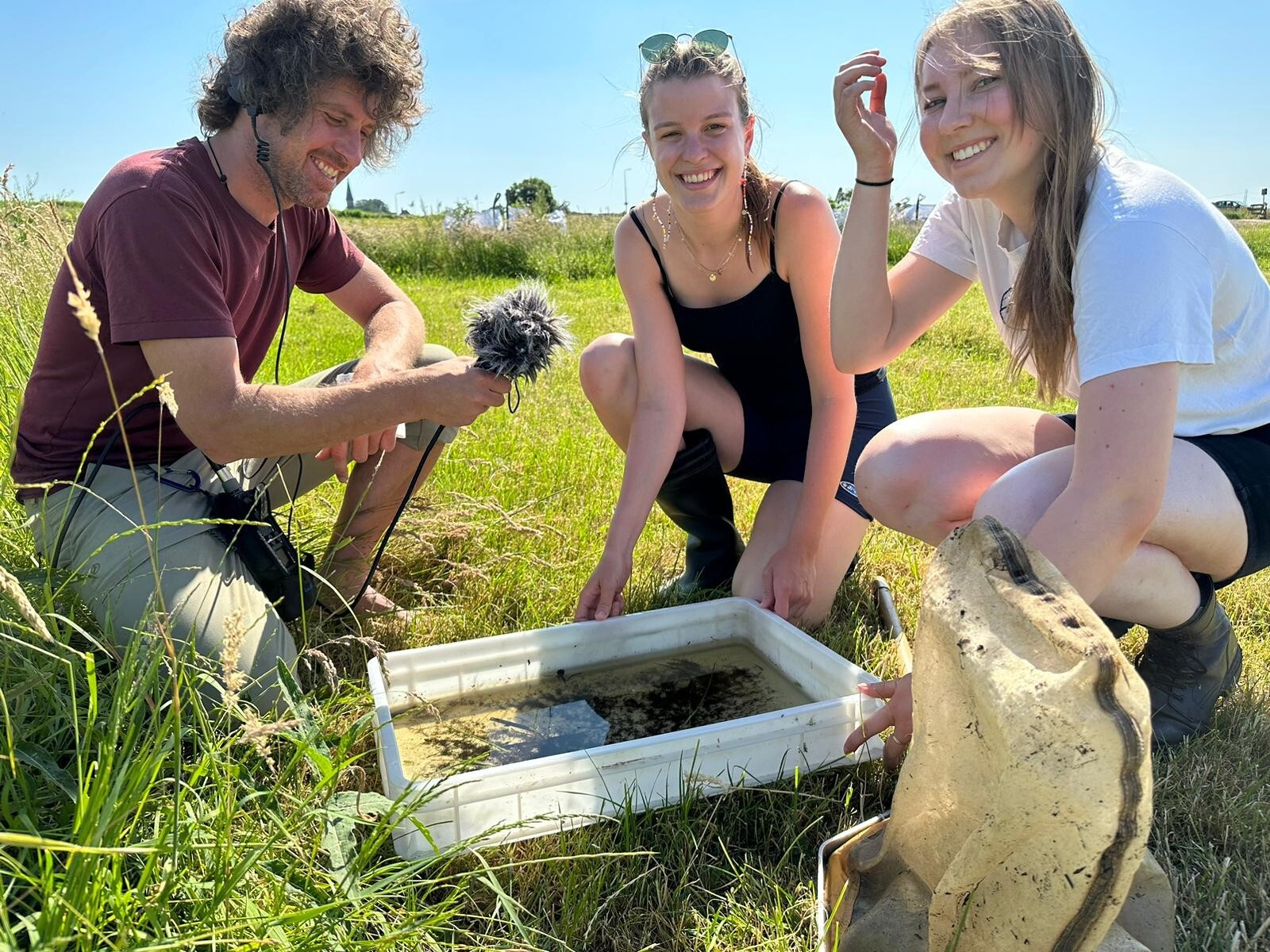 ellen van beesten in het water bij de sloot met krabbenscheer met studentes Martijne en Jara.© Foto: Krijn Trimbos