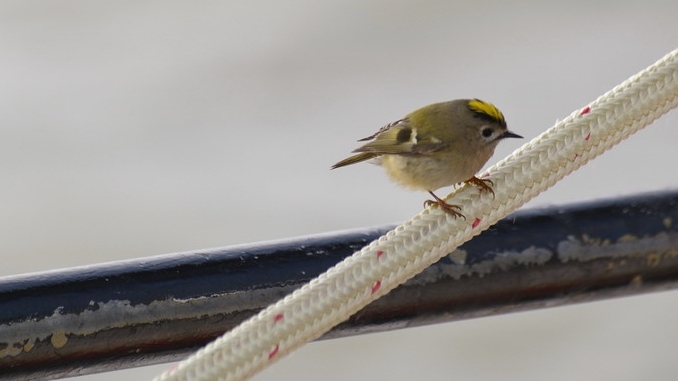 Op bijgaande foto zit een uitgeput goudhaantje uit te rusten op een zeilschip op de Waddenzee.