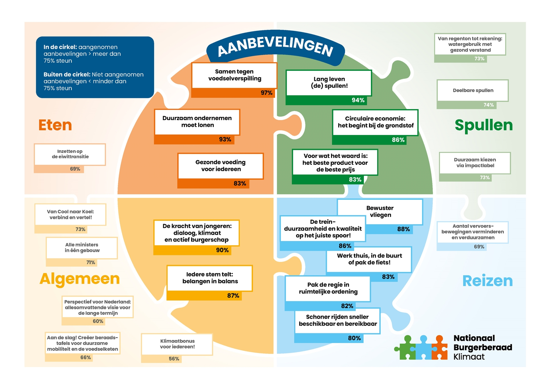 Na negen maanden hard werken kwamen de 175 deelnemers met een advies dat dertien aanbevelingen voor klimaatbeleid bevat. Zo staan er voorstellen in voor de landbouw: een kwart van de landbouwgrond moet in 2030 biologisch zijn. Nu is dat pas 4 procent. De uitstoot van CO2 en stikstof zou moeten worden belast, en dat moet gebruikt worden om de landbouw te verduurzamen. Ook moet het aantrekkelijker worden om met de trein te reizen of op de fiets naar het werk te gaan. Wie autorijdt zou elektrisch moeten rijden of op diesel uit plantaardige olie. Het beraad adviseert ook de invoer van een mondiale belasting op vliegtuigbrandstof.