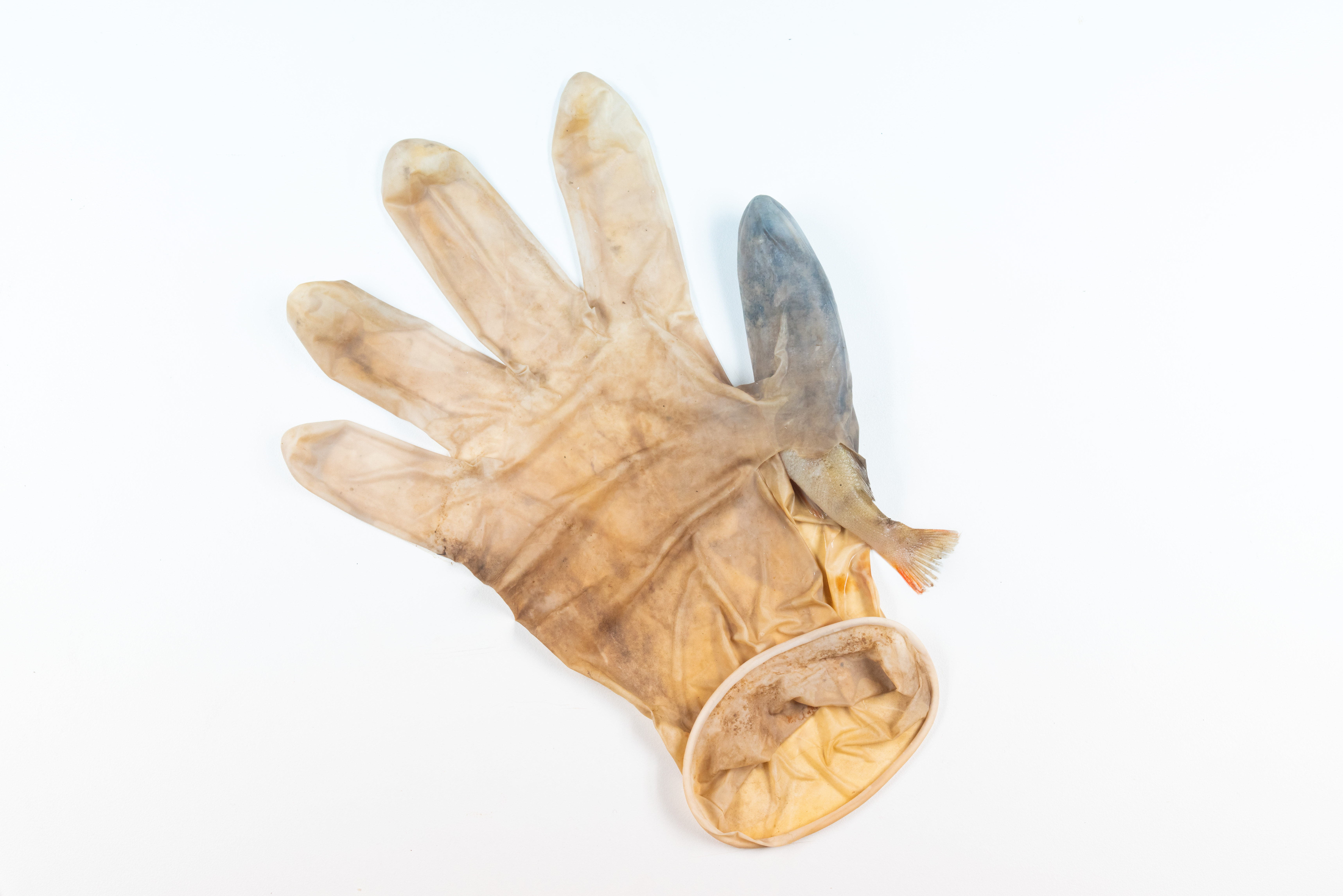 Op de foto van Auke Florian Hiemstra is een bizarre vondst te zien, een baars die verstrikt is geraakt in een medische handschoen. Hiemstra kwam dit tragische afvalslachtoffer tegen tijdens een van zijn wekelijkse clean-ups. Hij organiseert samen met zijn vriendin wekelijks kanotochten in het centrum van Leiden, waar allerlei afval de gracht uit wordt gevist. Zo visten ze tijdens de hoogtijdagen van de pandemie per keer zo'n 150 mondkapjes uit de gracht. Maar ook handschoenen en zelftesten vonden ze vaak.