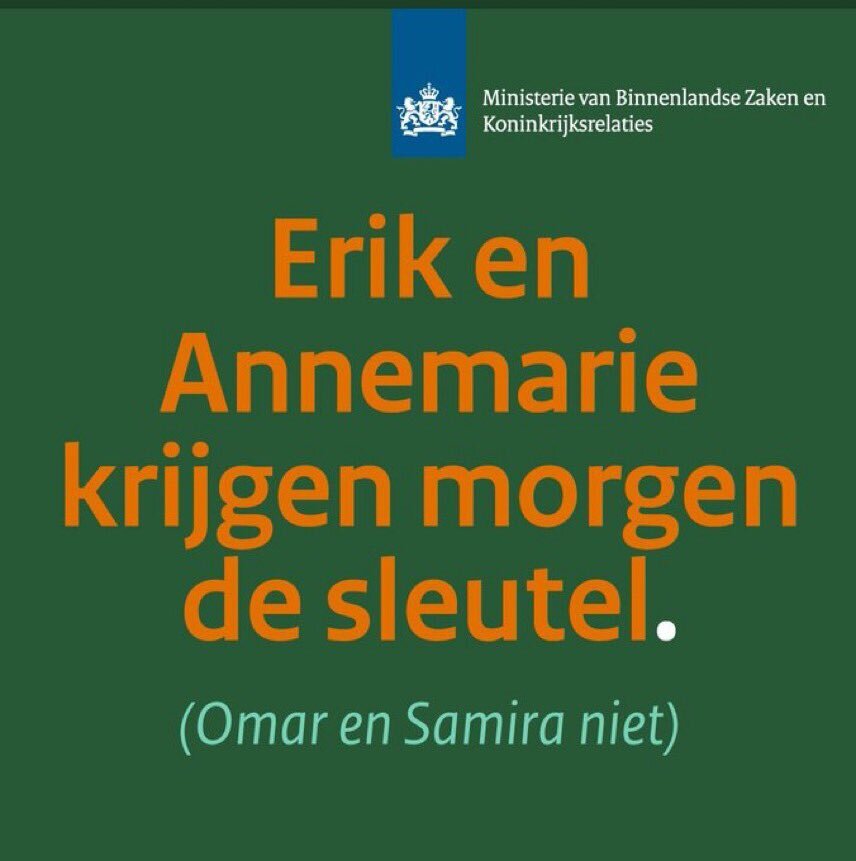 'Erik en Annemarie krijgen morgen de sleutel. (Omar en Samira niet)'. Die tekst staat in bushokjes om het probleem van woondiscriminatie aan te zwengelen. De Balie-directeur Yoeri Albrecht dacht aanvankelijk dat het om knutselwerk van een Twitteraar ging: "Je speelt mensen tegen elkaar uit!"