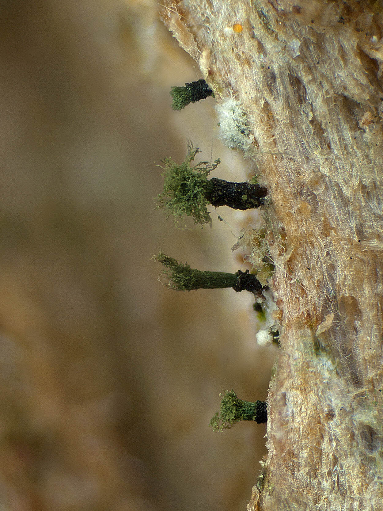 Veel regenschaduwspecialisten zijn een samenwerking tussen een schimmel en een alg, net zoals de korstmos. Maar er zijn ook de zogeheten niet-gelichenseerde regenschaduwspecialisten, die alleen uit een schimmel bestaan. Wat de regenschaduwspecialisten, ook wel Coniocarpen genoemd, verbindt, is hun uiterlijk: ze zien er namelijk allemaal uit als speldenknoppen. Er is nog veel mysterie rondom de biologie van deze schimmels, omdat ze tot nu toe nog relatief weinig bekend zijn.