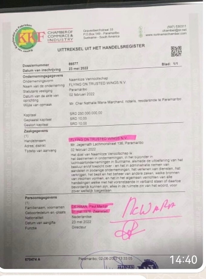 Maar De Haan lijkt er wel nog in te geloven. Deze week verscheen er een uittreksel van de kamer van koophandel, waaruit bleek dat De Haan een nieuwe maatschappij heeft opgericht met de naam Flying on trusted wings. Het document werpt genoeg vraagtekens op, maar uitleg blijft voorlopig uit. “President Santokhi presenteert pas over enkele weken het reddingsplan van De Haan”.