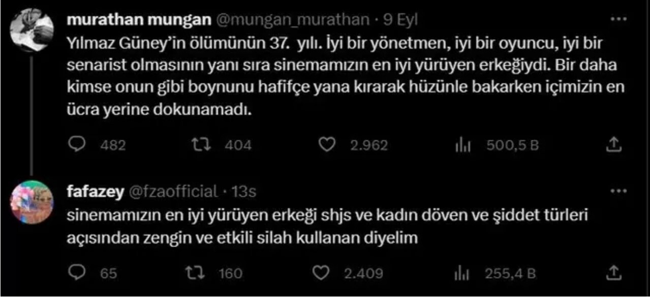 In dit bericht op platform X, voorheen Twitter, uitte de Turkse actrice Farah Zeynep Abudallah kritiek op filmmaker Yilmaz Güney. De actrice benadrukte dat Güney zich schuldig had gemaakt aan vrouwenmishandeling.