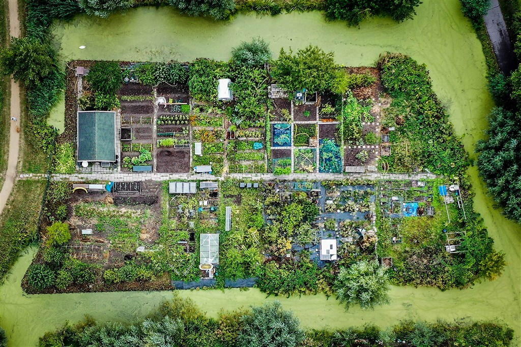 Dronefoto van een moestuinencomplex in de omgeving van de fabriek van Chemours in Dordrecht.