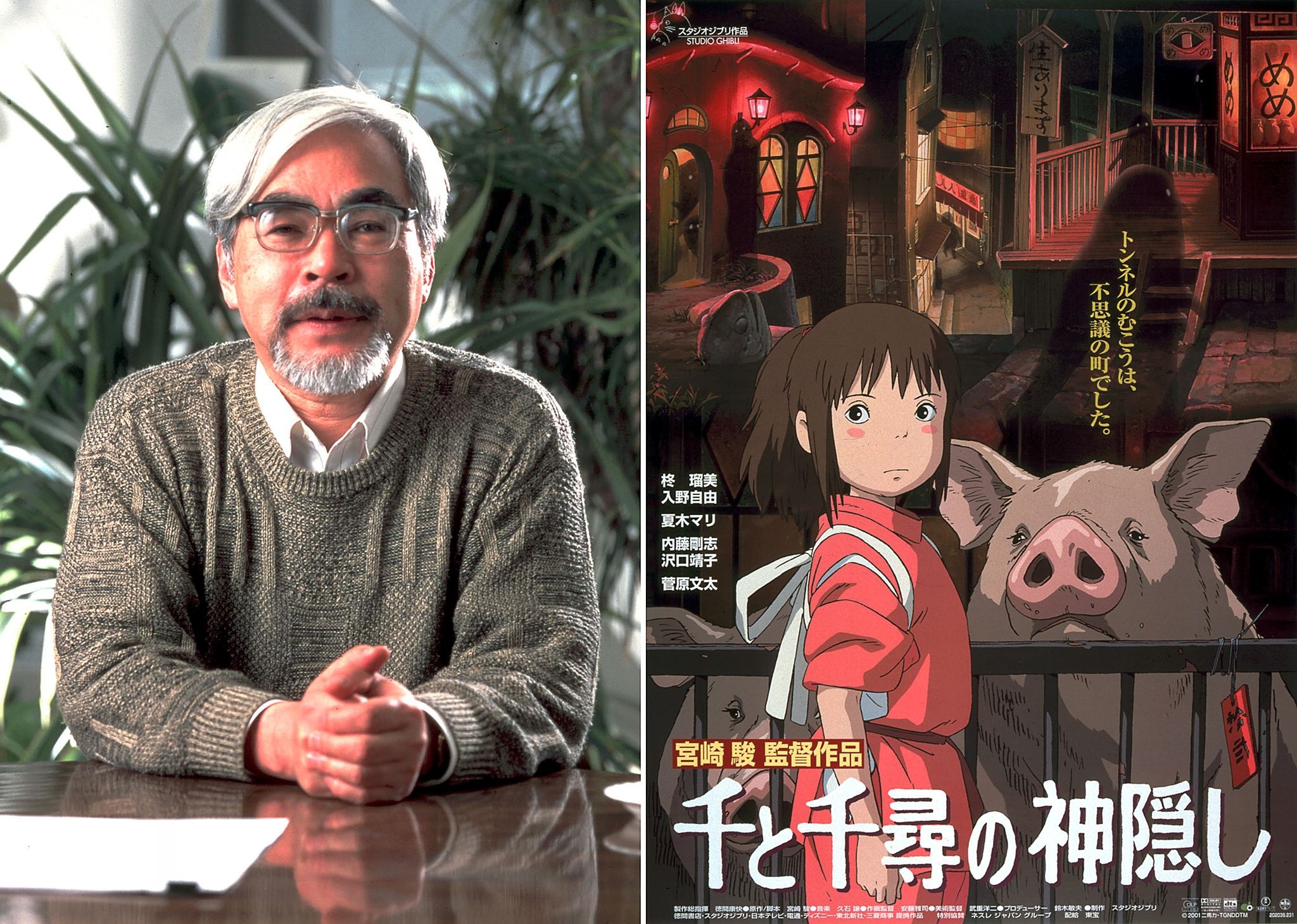 Filmmaker Hayao Miyazaki en een poster van de film Spirited Away: De reis van Chihiro uit 2001