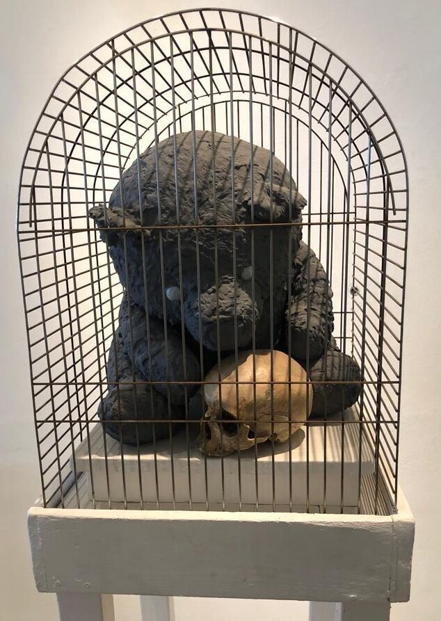Waar hij ook ging in zijn kunstenaarsbestaan, Mark sleepte de schedel als een soort talisman achter zich aan. Tot aan Parijs aan toe. "Ik had hem ergens in een hoek van mijn atelier liggen. Ik dacht: verdomme, ik moet daar iets mee. Het is toch het hoofd van iemand geweest. Kort daarop vond ik die teddybeer op een vuilnisbak. Die heb ik behandeld met verf, met die grijze kleur en heb ik hem Pepita in zijn armen gegeven."