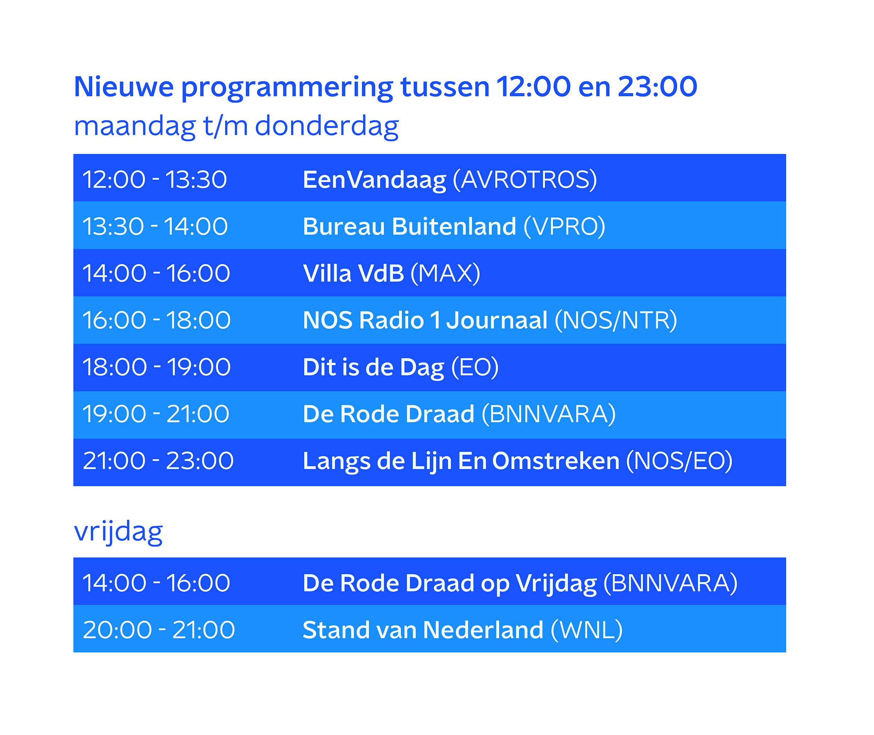 Het goed gewaardeerde EenVandaag (AVROTROS) met Suzanne Bosman gaat naar de middag tussen 12.00 en 13.30 uur. Tussen 16.00 en 18.00 uur is straks het NOS Radio 1 Journaal (NOS/NTR) met Fleur Wallenburg te horen. Het NOS Radio 1 Journaal in ochtend met Astrid Kersseboom blijft een vaste waarde tussen 06.00 en 09.30 uur.