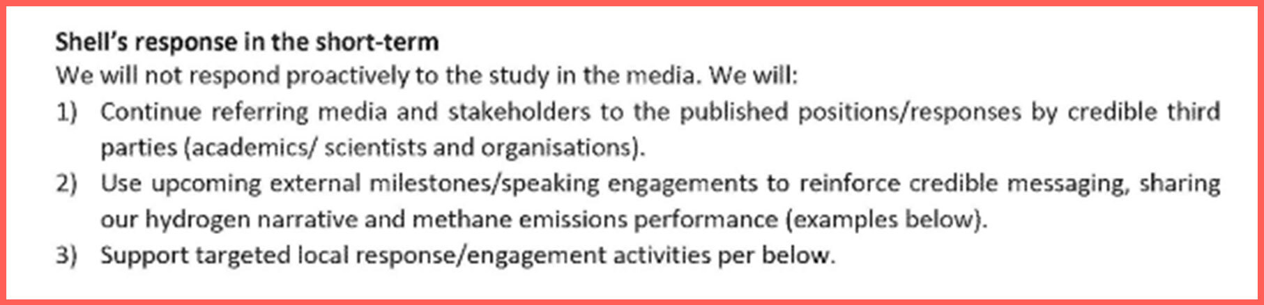 Shell schrijft in het interne strategiedocument dat het niet zelf in de media zal reageren op de studie. In plaats daarvan kiest het voor een strategie waarbij ze 'media en stakeholders doorverwijzen naar (...) geloofwaardige derde partijen', zoals 'wetenschappers of organisaties'. Ook wil Shell publieke optredens aangrijpen 'om een geloofwaardige boodschap uit te dragen' en hun 'waterstofnarratief te delen'.
