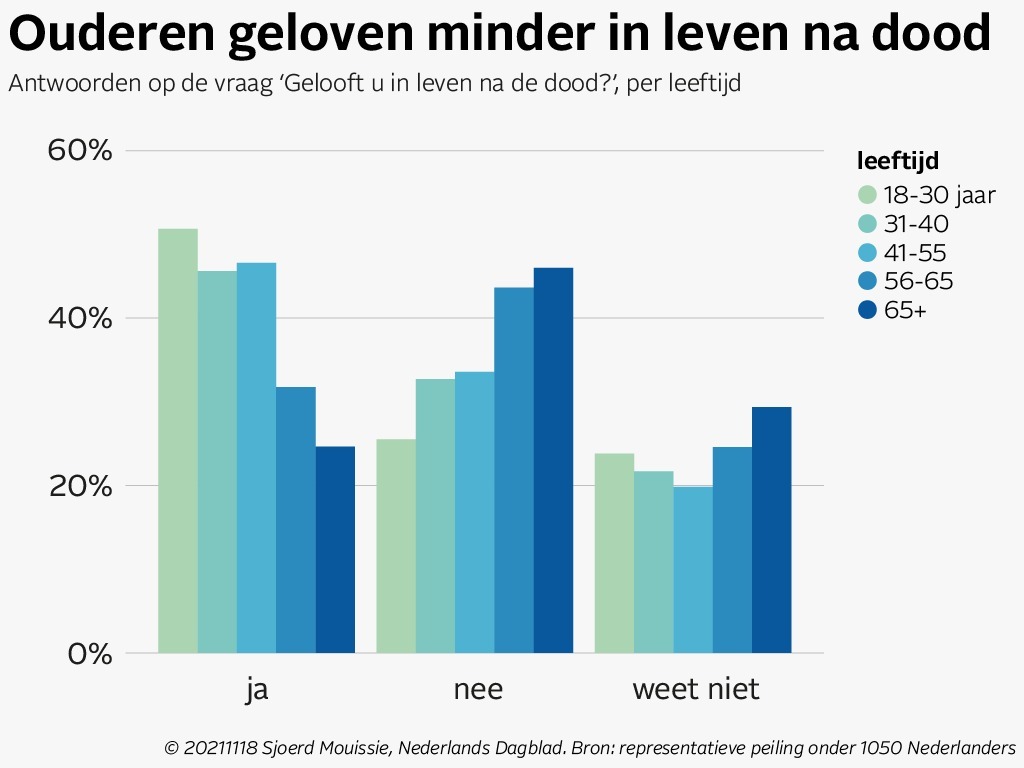 Jongeren geloven ook vaker in leven na de dood dan ouderen doen. Ongeveer de helft van de 18 tot 30-jarigen denkt dat er leven na de dood is. Naarmate mensen ouder worden, zijn er minder mensen die dat geloven. Theoloog Arnold Huijgen vindt het opvallend, maar denkt dat het te maken kan hebben met de secularisatie van de jaren '60: "Die generatie heeft voor een belangrijk deel de secularisatie gedreven, afscheid heeft genomen van kerk en geloof. En onder jongere generaties meen ik wel te zien dat er wat meer openheid is voor spiritualiteit en de gedachte van leven na de dood."