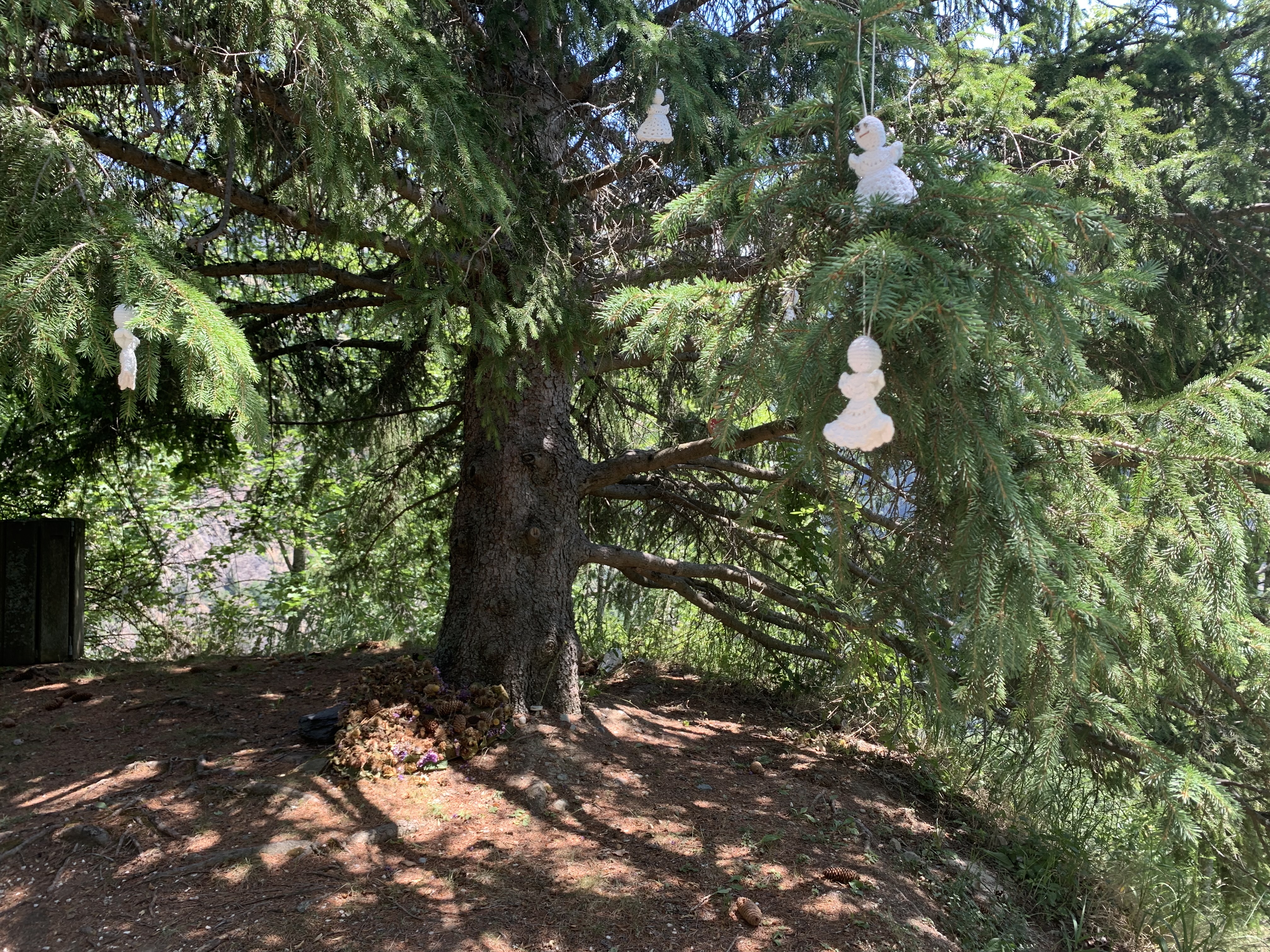 De man wenkt mij, hij wil wat laten zien. We laten het wegdek achter ons en lopen tussen wat struiken door. Hij stopt bij een boom en zegt met zijn gehavende stem: “Kijk. Hier word ik nou stil van.” Voor de boom ligt een houten hart. Aan de takken hangen witte engeltjes.