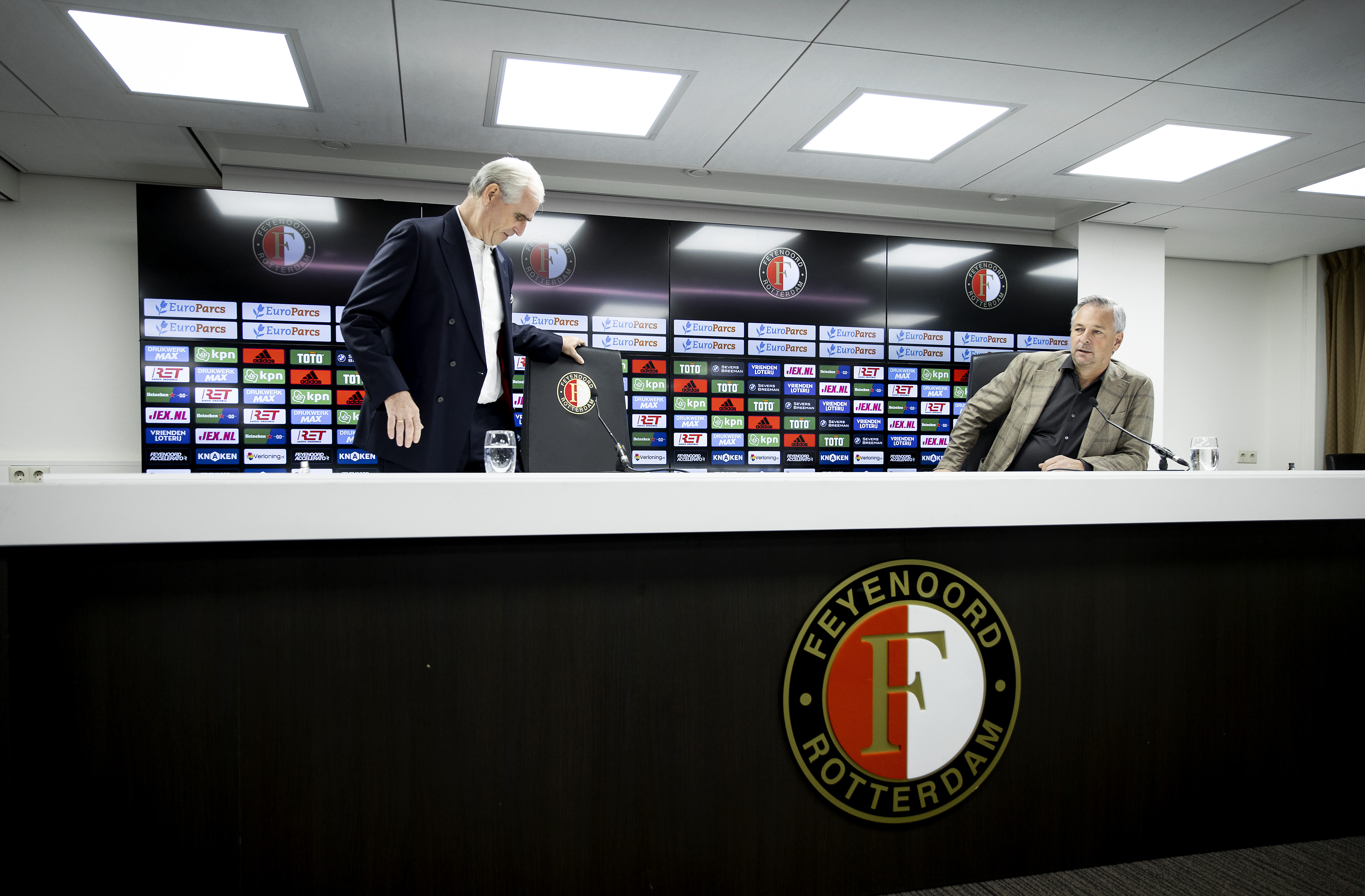 President-commissaris Toon van Bodegom (R) en vice-voorzitter Gerard Moussault van Feyenoord tijdens een persconferentie in stadion de Kuip