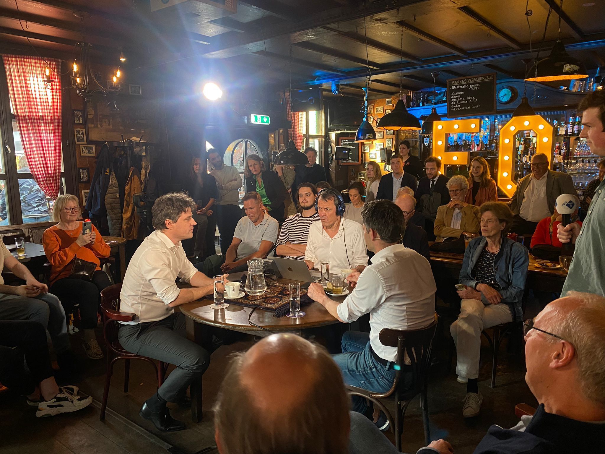 Henri Bontenbal (l) en Tom Berendsen (r) te gast in het DIDD Verkiezingscafé met Tijs van den Brink