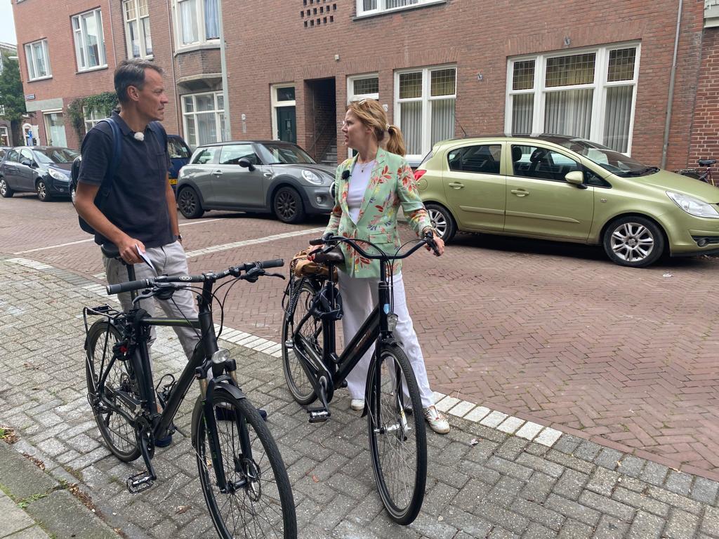 Cora van Nieuwenhuizen en Tijs van den Brink op de fiets in de bomenbuurt van Den Haag