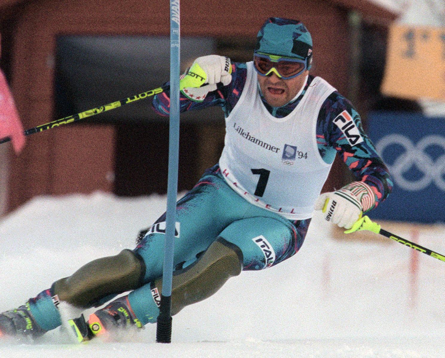 De Italiaanse 'playboy' Alberto Tomba tijdens de slalom van de Olympische Winterspelen van 1994 in Lillehammer.