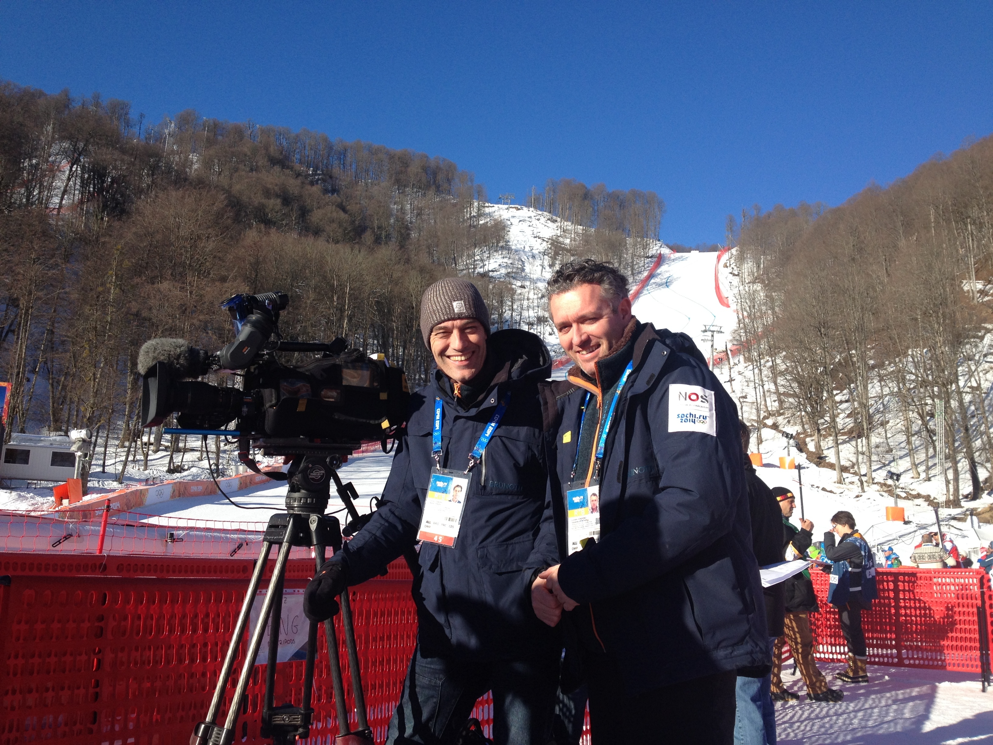 Cameraman Wilko Lobeek en NOS-verslaggever Kees Jongkind onderaan de skipiste van de Olympische Winterspelen van Sotsji in 2014.