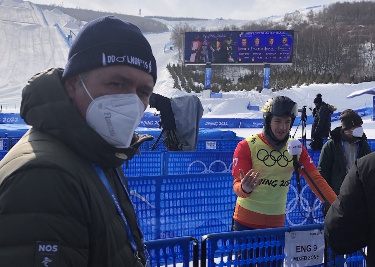 NOS-verslaggever Kees Jongkind met op de achtergrond snowboarder Glenn de Blois na zijn uitschakeling op de Olympische Winterspelen in Peking.