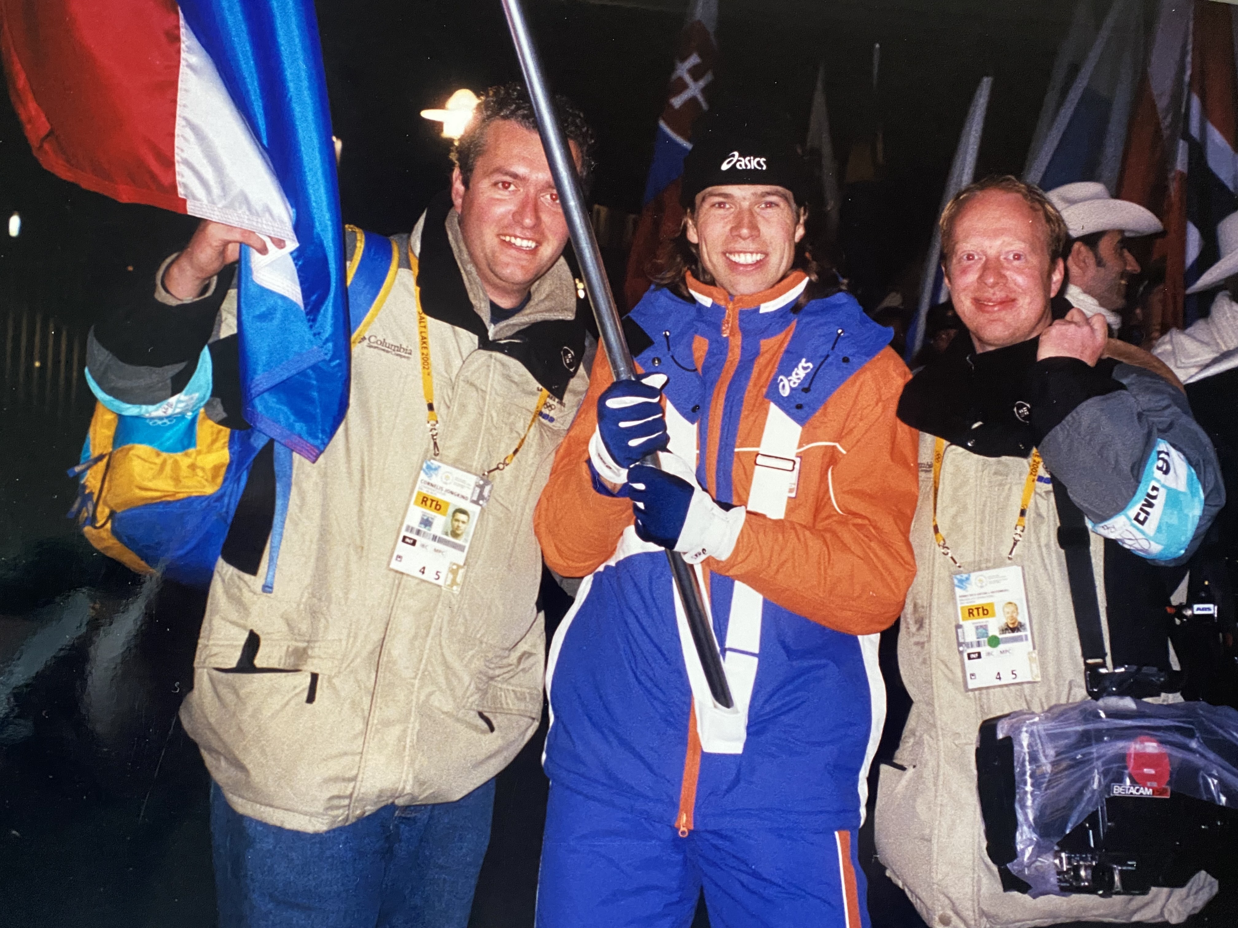 NOS-verslaggever Kees Jongkind (links) en cameraman Dennis Westenberg (rechts) op de foto met gouden medaillewinnaar Gerard van Velde in Salt Lake City 2002.