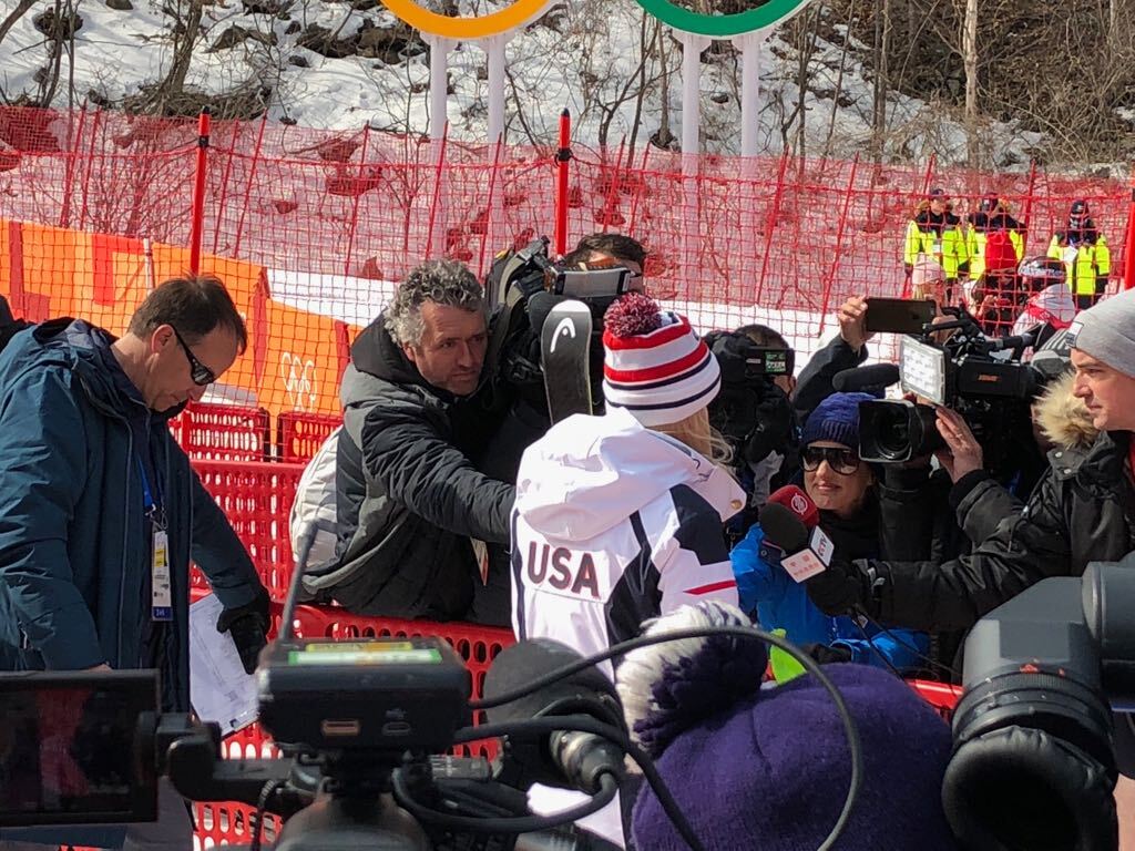 NOS-verslaggever Kees Jongkind in de mixed zone met alpineskiester Lindsey Vonn tijdens de Olympische Winterspelen van PyeongChang in 2018.