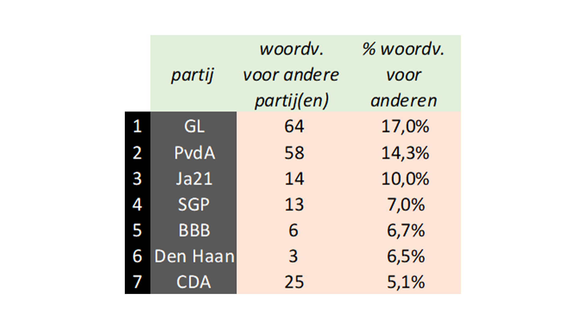 Nu blijkt dat die samenwerking tijdens Rutte IV ook vaak de vorm aannam van gezamenlijke woordvoering. Bij de 627 commissiedebatten – de vergaderingen buiten de plenaire zaal – spraken parlementariërs één op de twintig keer ook namens een andere partij. De PvdA en GroenLinks deden dat het vaakst.