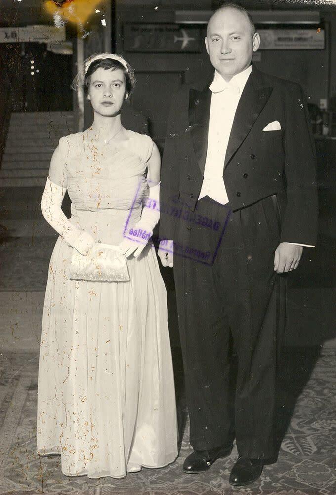 Esther met haar eerste echtgenoot Joshua tijdens de Nobelprijs ceremonie in Stockholm in 1958. Eigendom van de Esther M. Zimmer Lederberg Memorial Website.